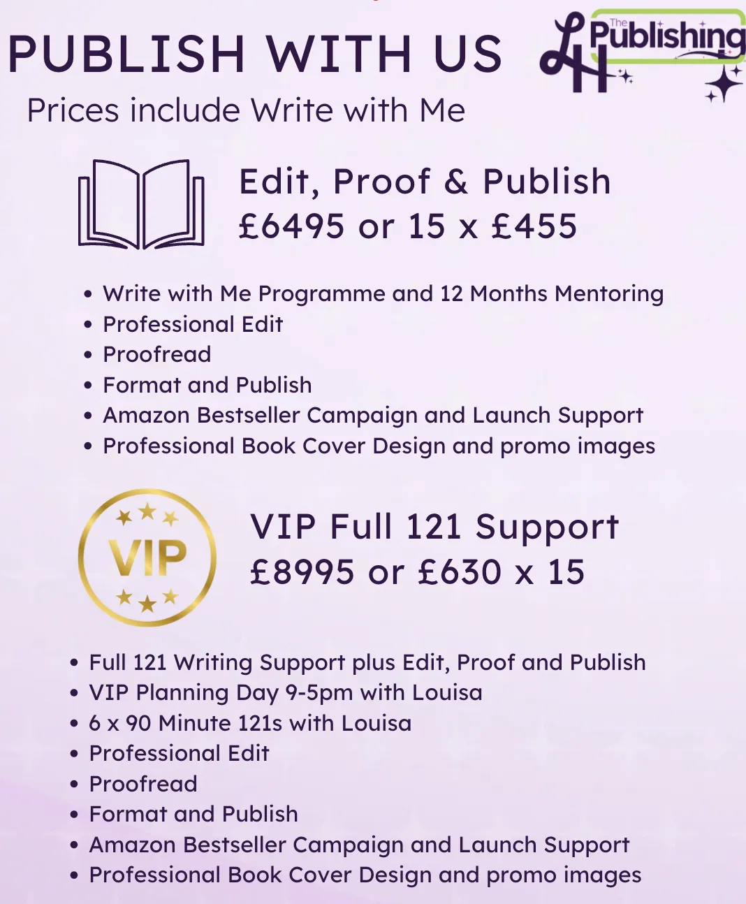 Write with Me will mean that I can support so many more people to write and help you to self-publish, or my team at LH Publishing are still here to support you with a done-for-you service that professionally publishes your book for you and supports you to launch and hit that coveted Bestseller status of which I have a 100% success rate!